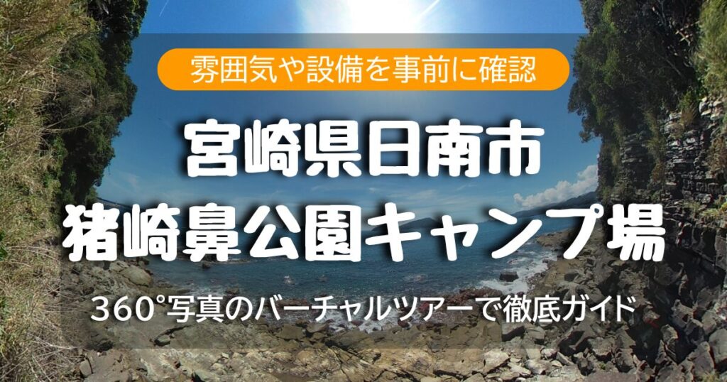 海に面した宮崎県日南市の猪崎鼻公園キャンプ場は、無料かつ予約不要で利用できます。オートキャンプサイトもあり、遊歩道をあるけば森林浴も楽しめるため、週末には多くのキャンパーでにぎわいます。管理は日南市が担っており、ホームページで案内していますが、情報は多くありません。そこで本記事ではキャンプサイトの雰囲気やトイレなどの設備を360°写真のバーチャルツアーで紹介します。利用前の下見代わりにぜひ、ご覧ください。