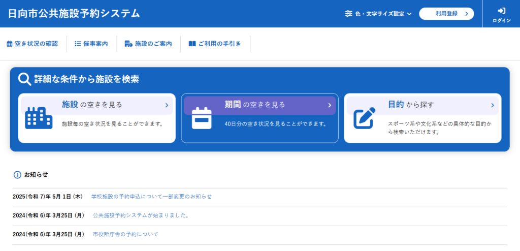 • 初めて利用する場合は、日向市公共施設予約システムで利用登録が必要です。