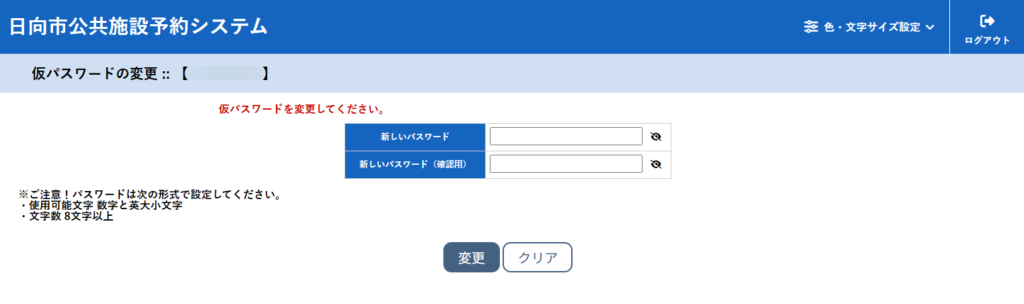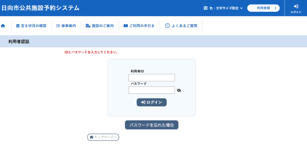 「日向市公共施設予約システムから利用登録のお知らせ」というメールに記載されてある「利用者ID」と「仮パスワード」でログインする