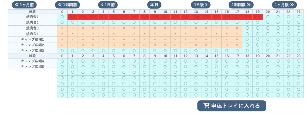 利用する時間帯をドラッグしてまとめて選び「申込トレイに入れる」をクリック