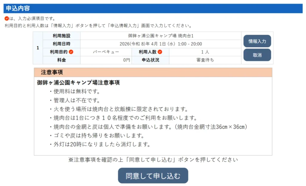「情報入力」ボタンを押して利用目的と利用人数を入力し、「同意して申し込む」ボタンをクリック