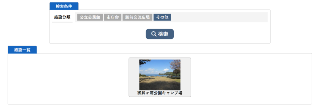 「検索条件」から「その他」のタブをクリックし、御鉾ヶ浦公園キャンプ場を選ぶ