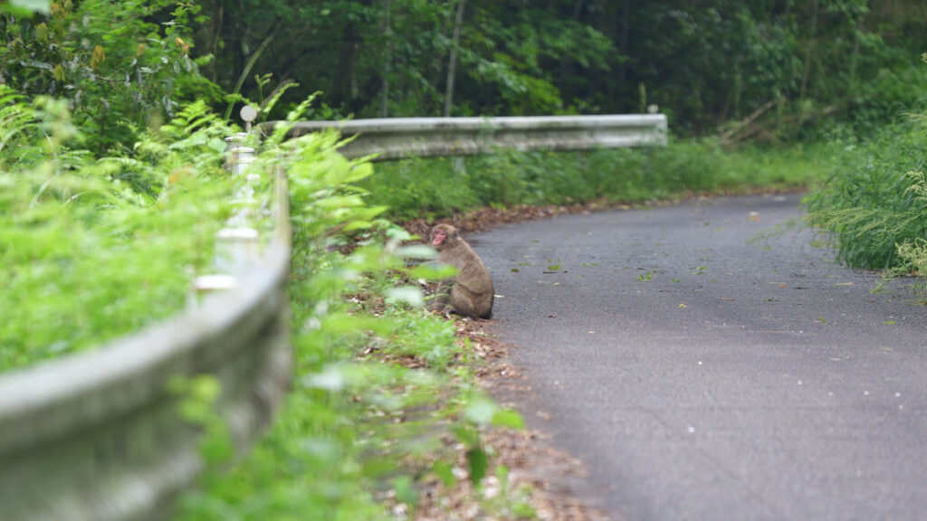 青鹿ダムに向かう道中、野性のサルに遭遇しました。もし遭遇したら、うかつに近づかないようにしましょう!!