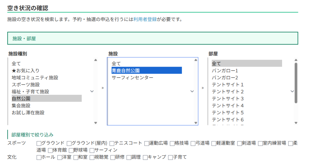 - Web予約画面に出てくるテントサイト1~10は、サイトが1~10まで整備されているわけではなく、システムの便宜上、そう表示されているだけです。開いているところを予約すればOKです